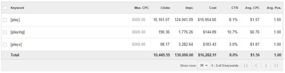 Diğer bir örneğe geçelim. “Play” kelimesini ele alırsak Google’ın mantığına göre “plays” ya da “playing” kelimelerini bu kelime ile birleştirmek gerekmektedir. Bu birleştirmenin sonucunda bu üç kelime aynı aranma oranlarına ve aynı fiyatsal değerlere sahip olarak gözükmektedir.